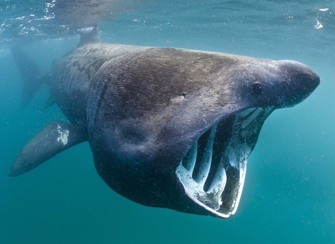 The large, black, triangular dorsal fin moves slowly through the water, with the tail tip and bulbous snout often visible above the waves too. The basking shark has a massive, grey body and swims with its cavernous mouth agape.Where to find