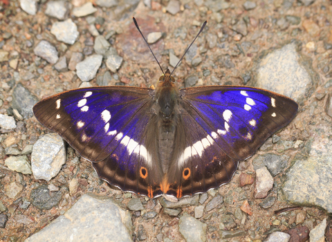 The male purple emperor is an unmistakeable glossy purple above, with white bands across its wings and orange-ringed eyespots under the brown forewings. The female is brown and similar to the white admiral in appearance, but also has orange-ringed eyespots under the forewings. Females are larger than males and both are larger than the more common white admiral.Where to find