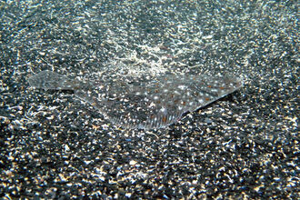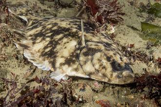 A Montagu's blenny lurking by an underwater patch of barnacles